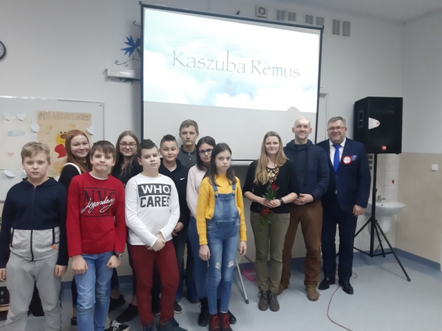 W niedzielne popołudnie 9 lutego 2020 roku uczniowie naszej szkoły wzięli udział w niecodziennym wydarzeniu. W Staniszewie w szkole odbył się pokaz filmu pt. „Kaszuba Remus” nagrany na podstawie powieści Aleksandra Majkowskiego „Życie i przygody Remusa”. Wśród gości pokazu byli reżyserowie filmu pani Ewelina Karczewska i pan Piotr Zatoń. Dzięki tej projekcji mogliśmy bliżej poznać treść najważniejszej kaszubskiej powieści. Zachwyt budziły przepiękne krajobrazy. Dodatkowym atutem filmu były przedstawione zwyczaje kaszubskie. Byliśmy też zaskoczeni faktem, że lektorem w języku kaszubskim był nasz nauczyciel pan Janusz Mamelski. Na koniec zrobiliśmy sobie wspólne zdjęcie z reżyserami filmu i panem Burmistrzem Kartuz, który również uczestniczył w pokazie.